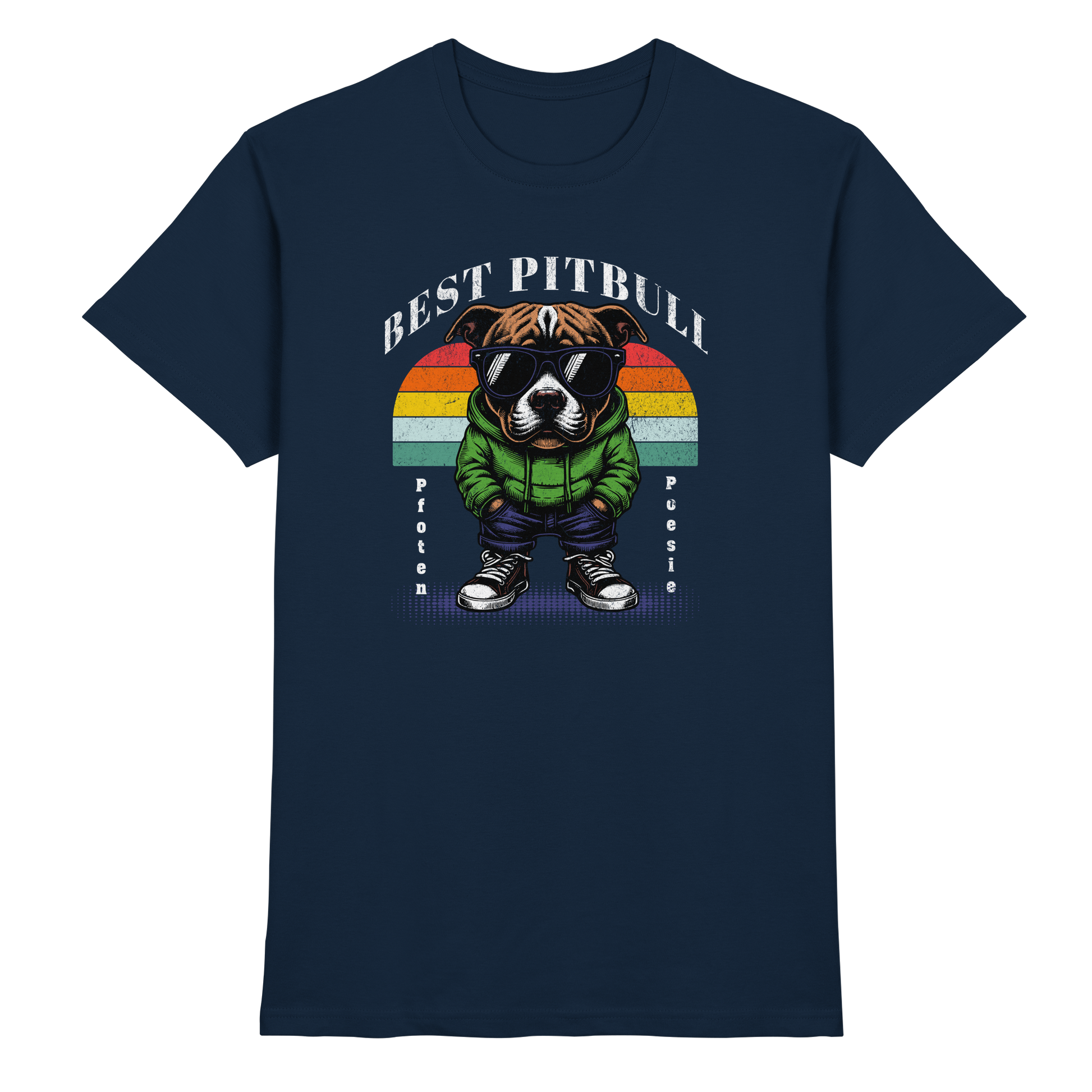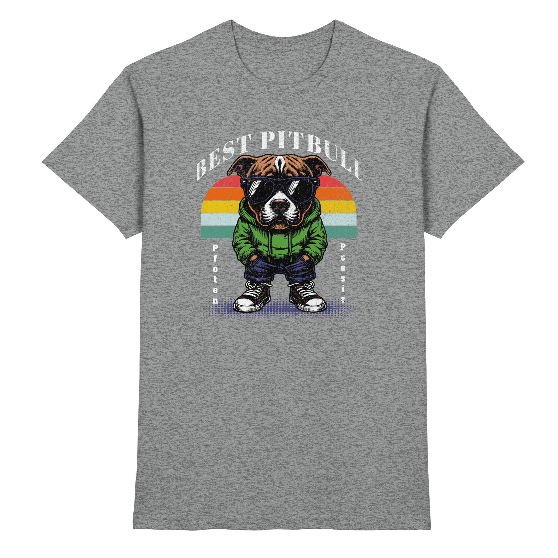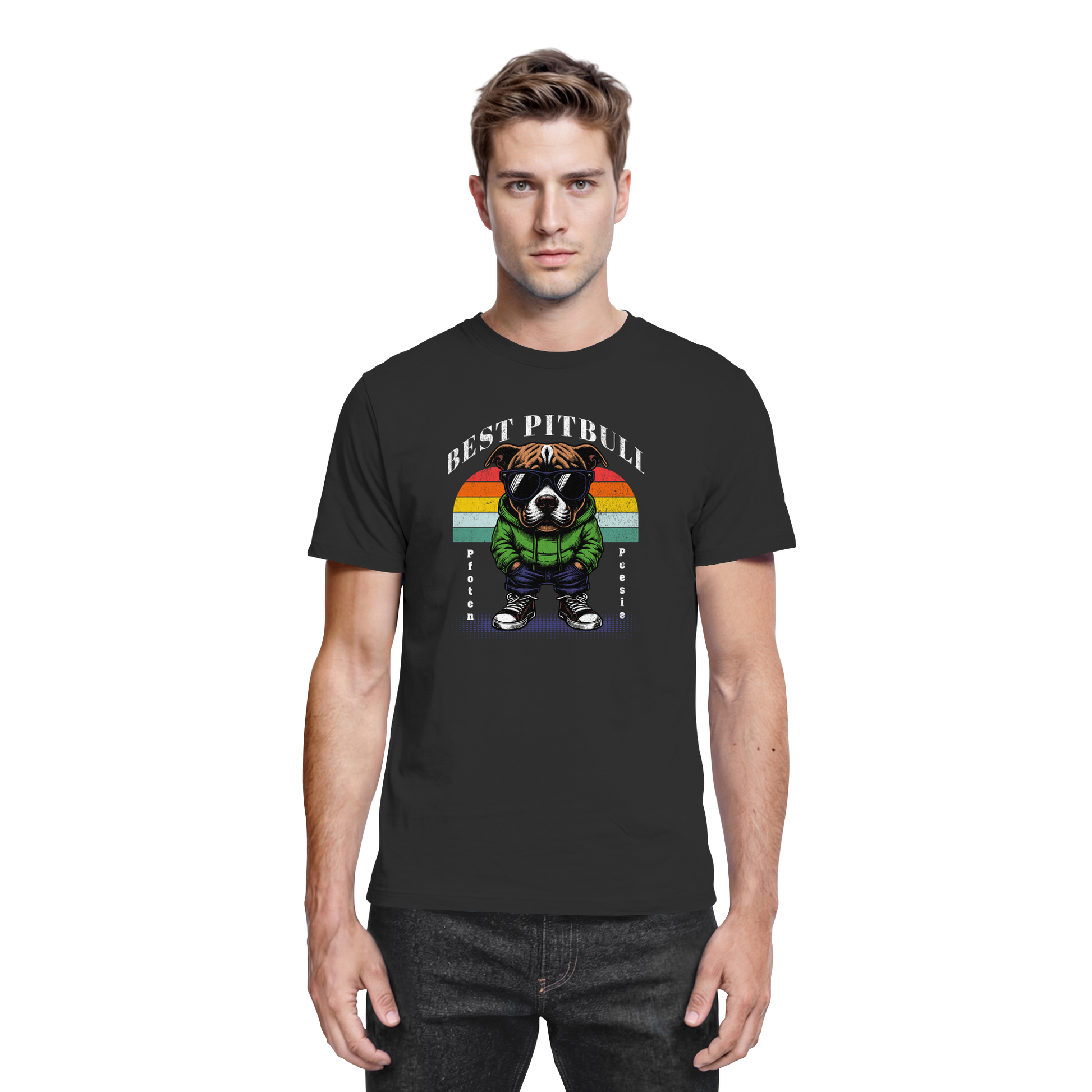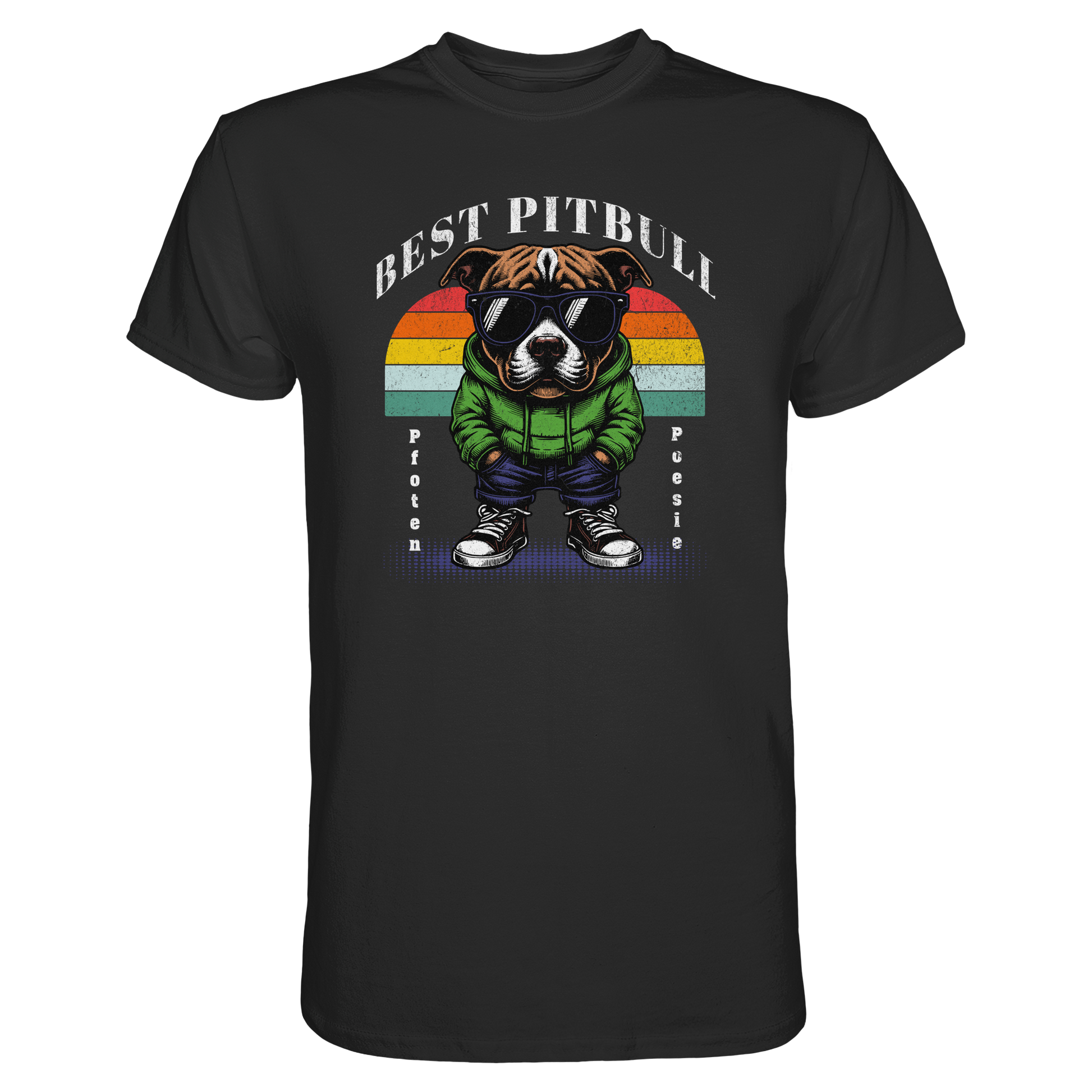 Unser Shirt feiert die wahre Stärke und den einzigartigen Charakter des Pitbulls. Mit Sonnenbrille, Jacke und lässigem Style zeigt der Pitbull auf dem Print, was ihn so besonders macht: stark, treu und absolut cool.