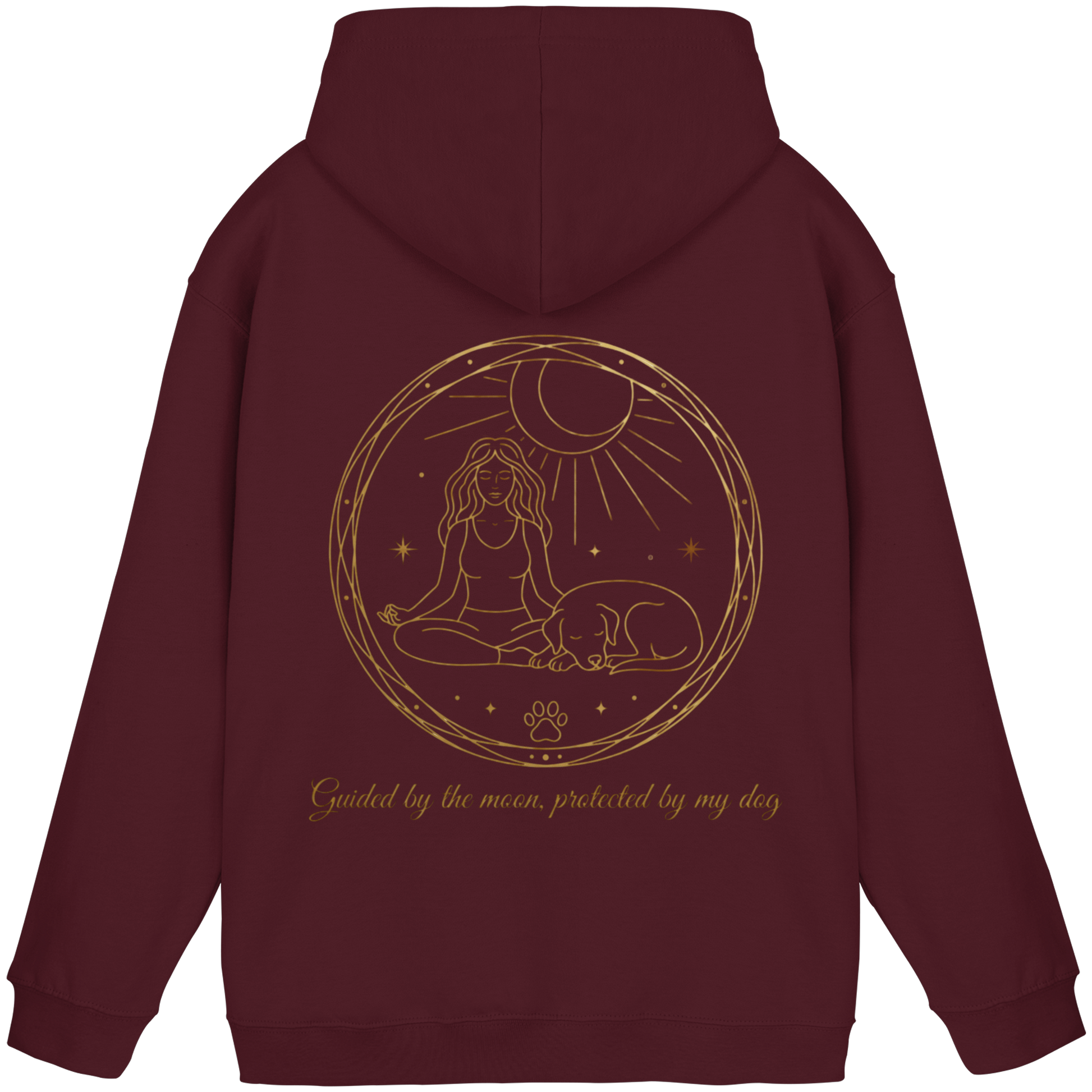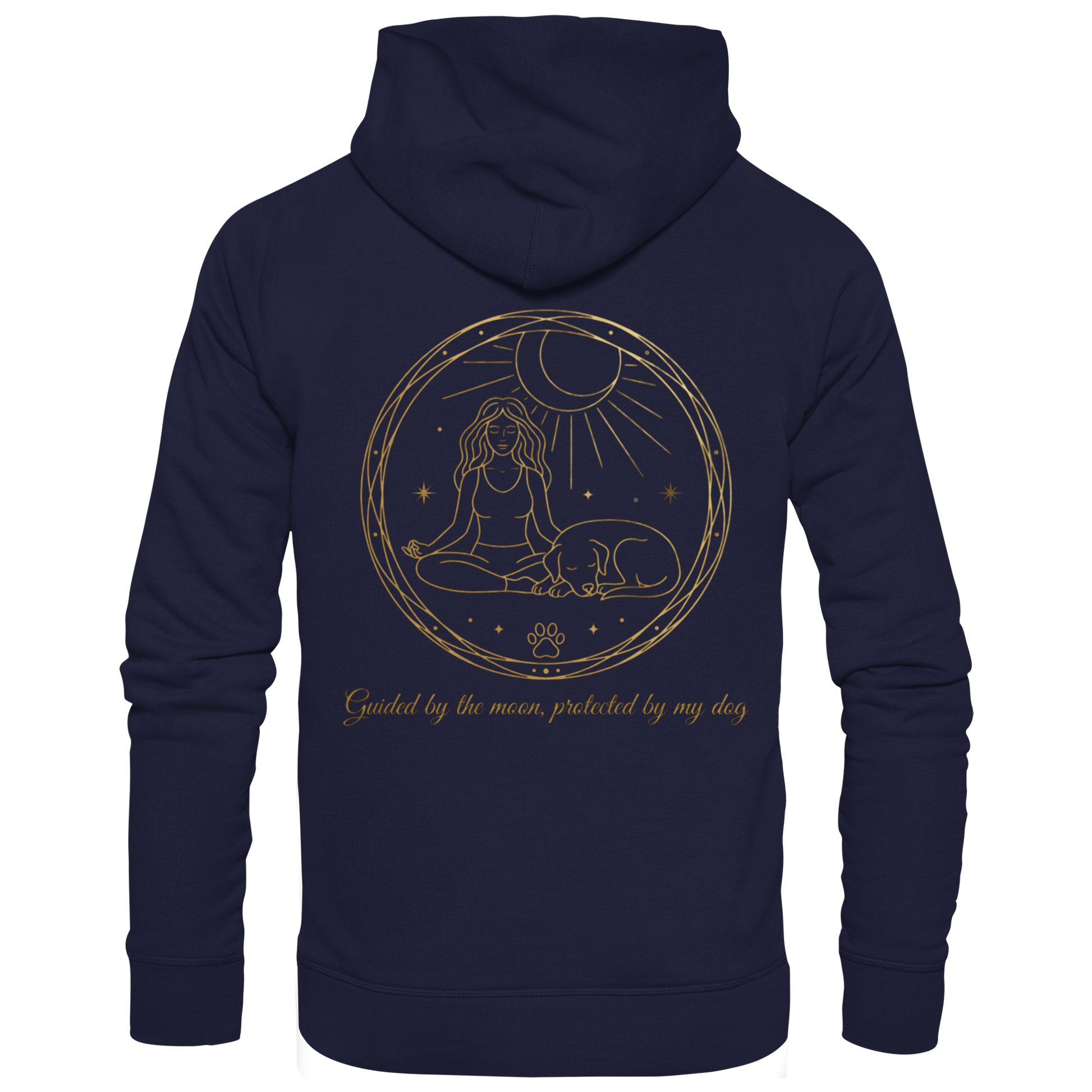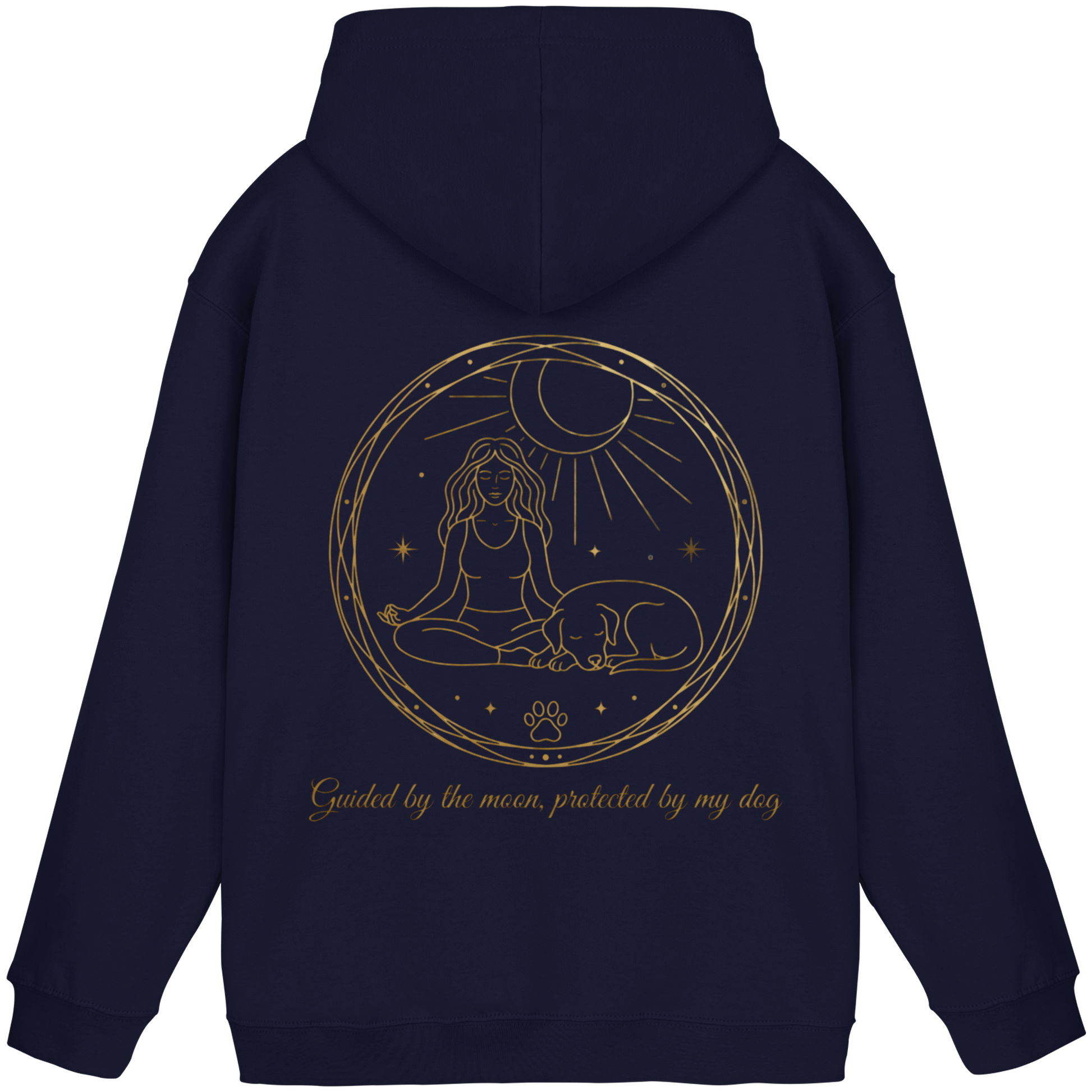 Premium Pfotenpoesie Unisex Hoodie Guided by the Moon, Protected by My Dog