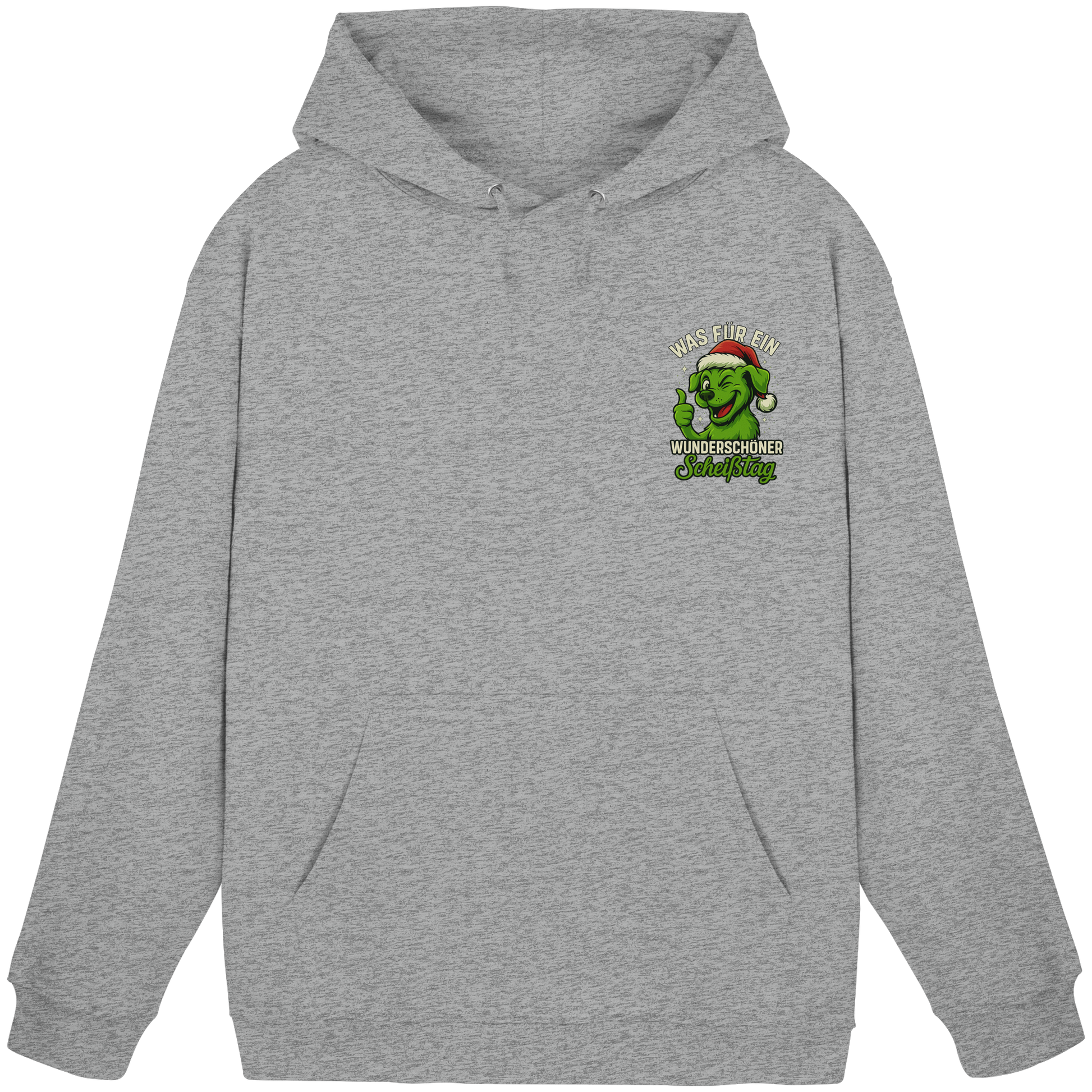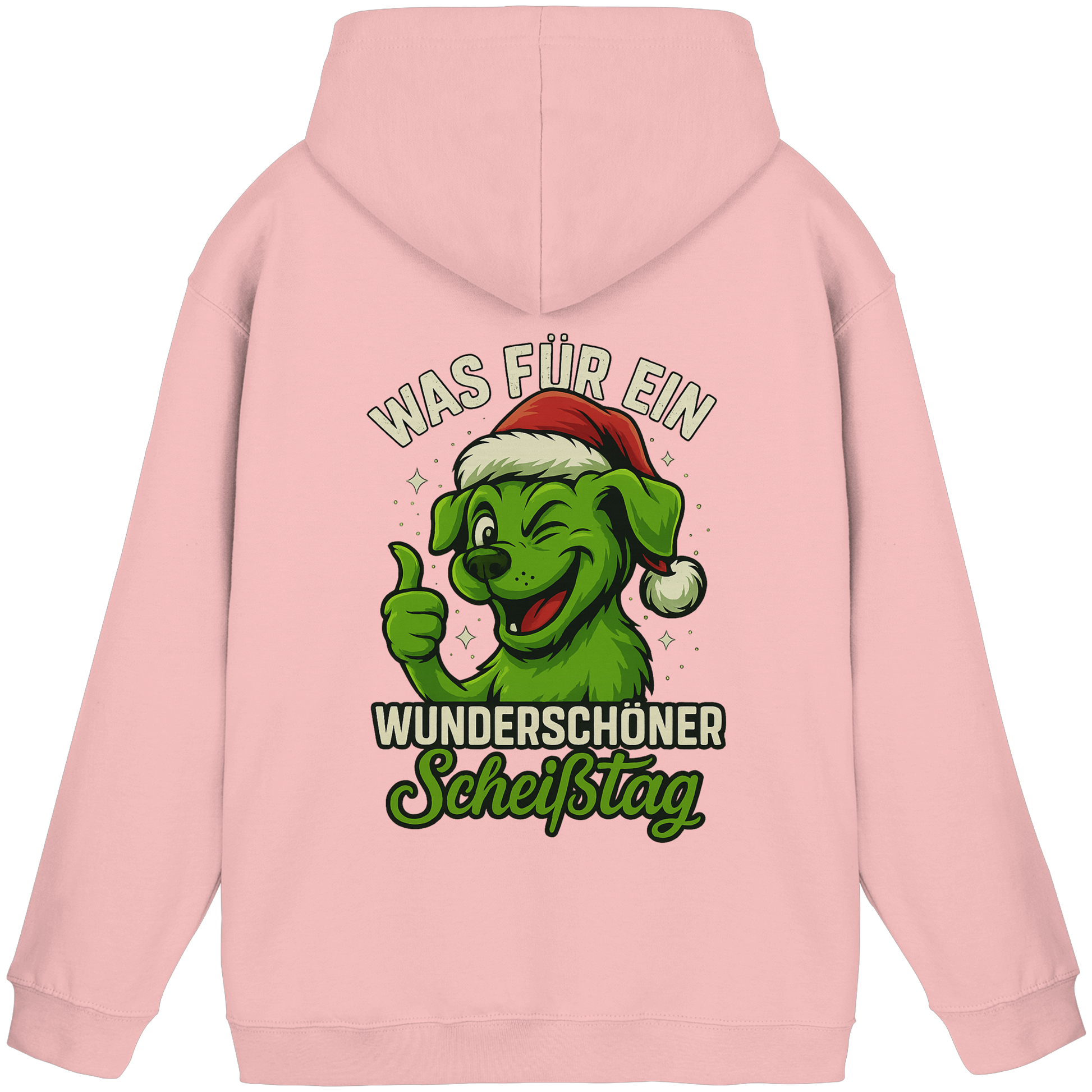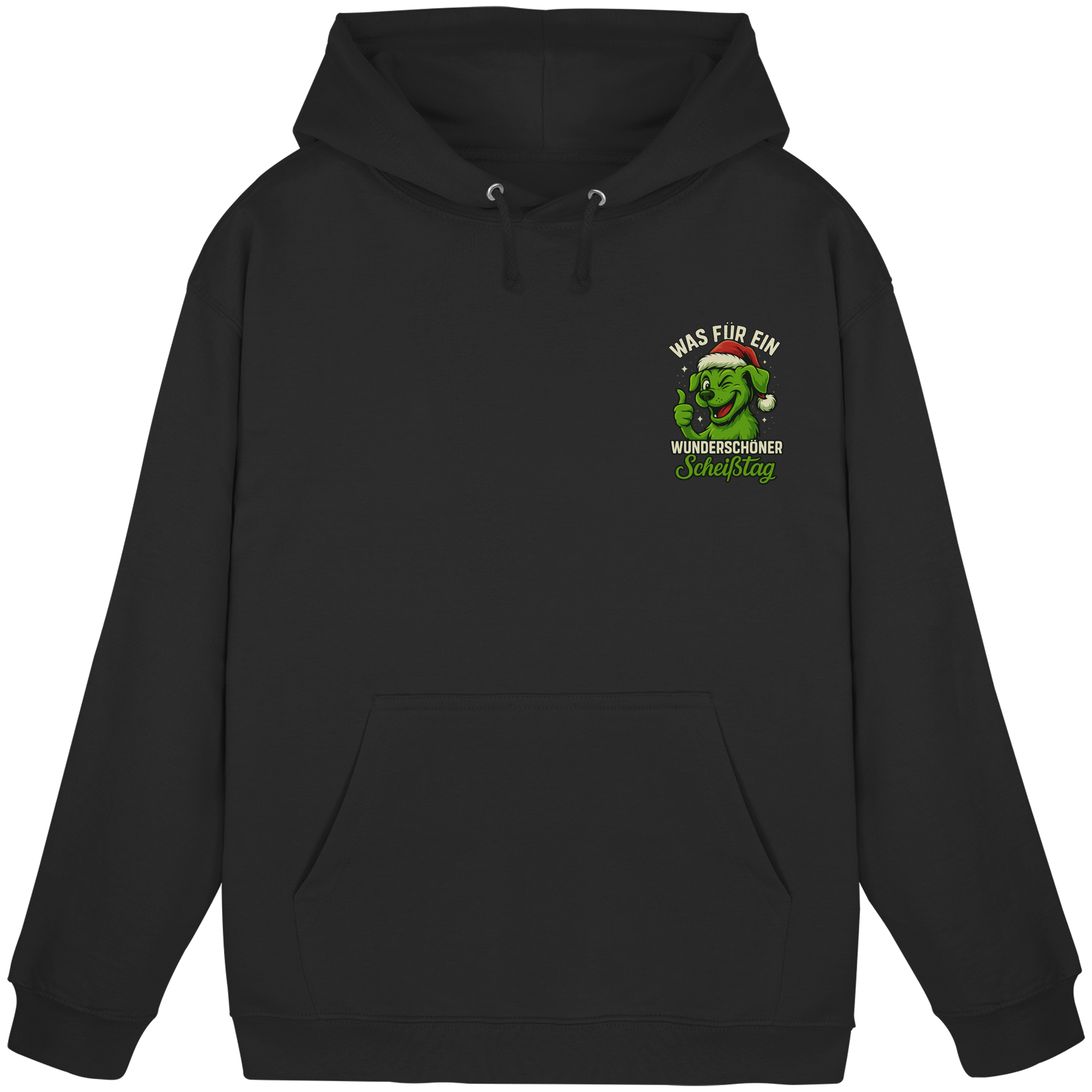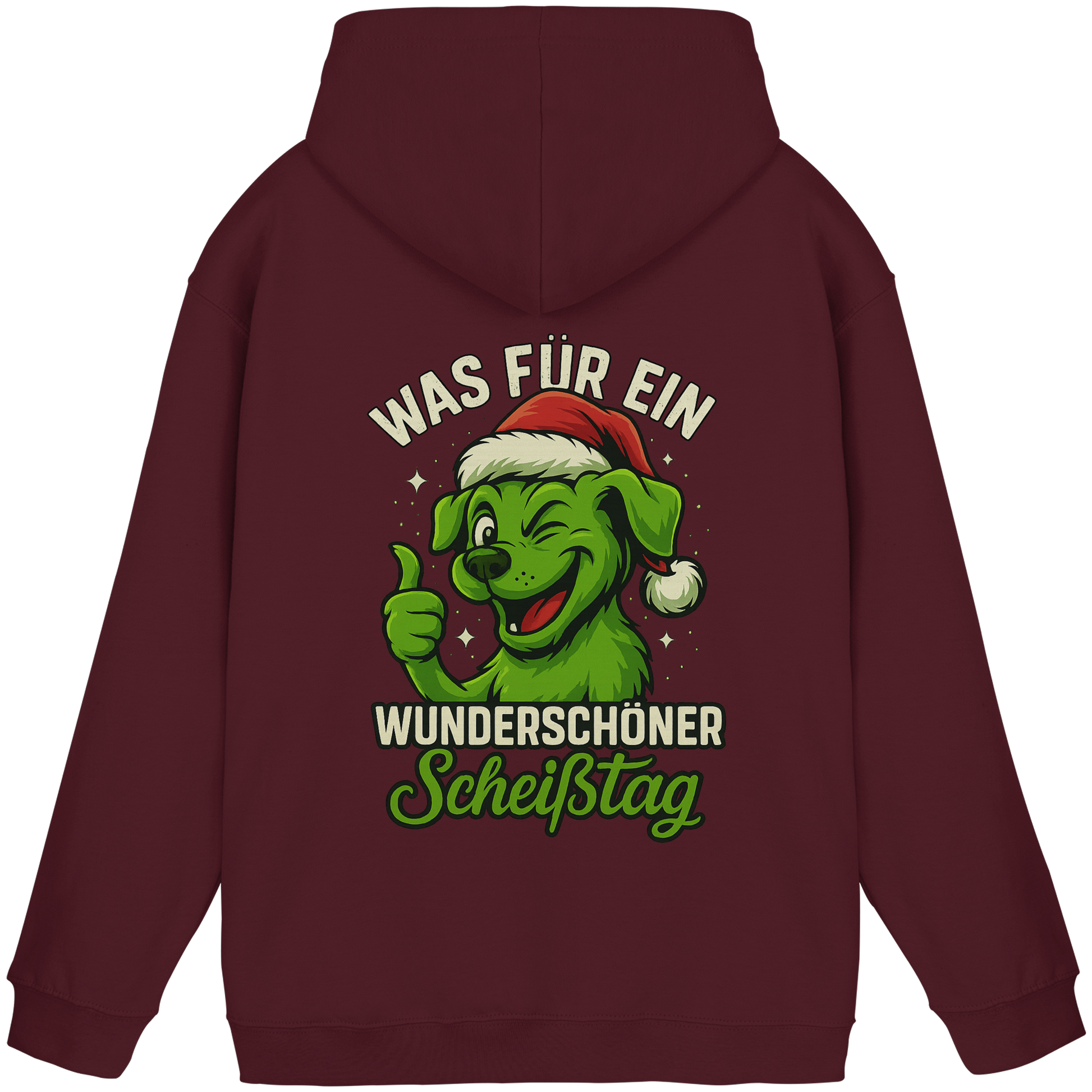 Der freche, grinsende Hund mit Weihnachtsmütze und dem Spruch Was für ein wunderschöner Scheißtag bringt schwarzen Humor, Lebenslust und Hundeliebe perfekt zusammen.