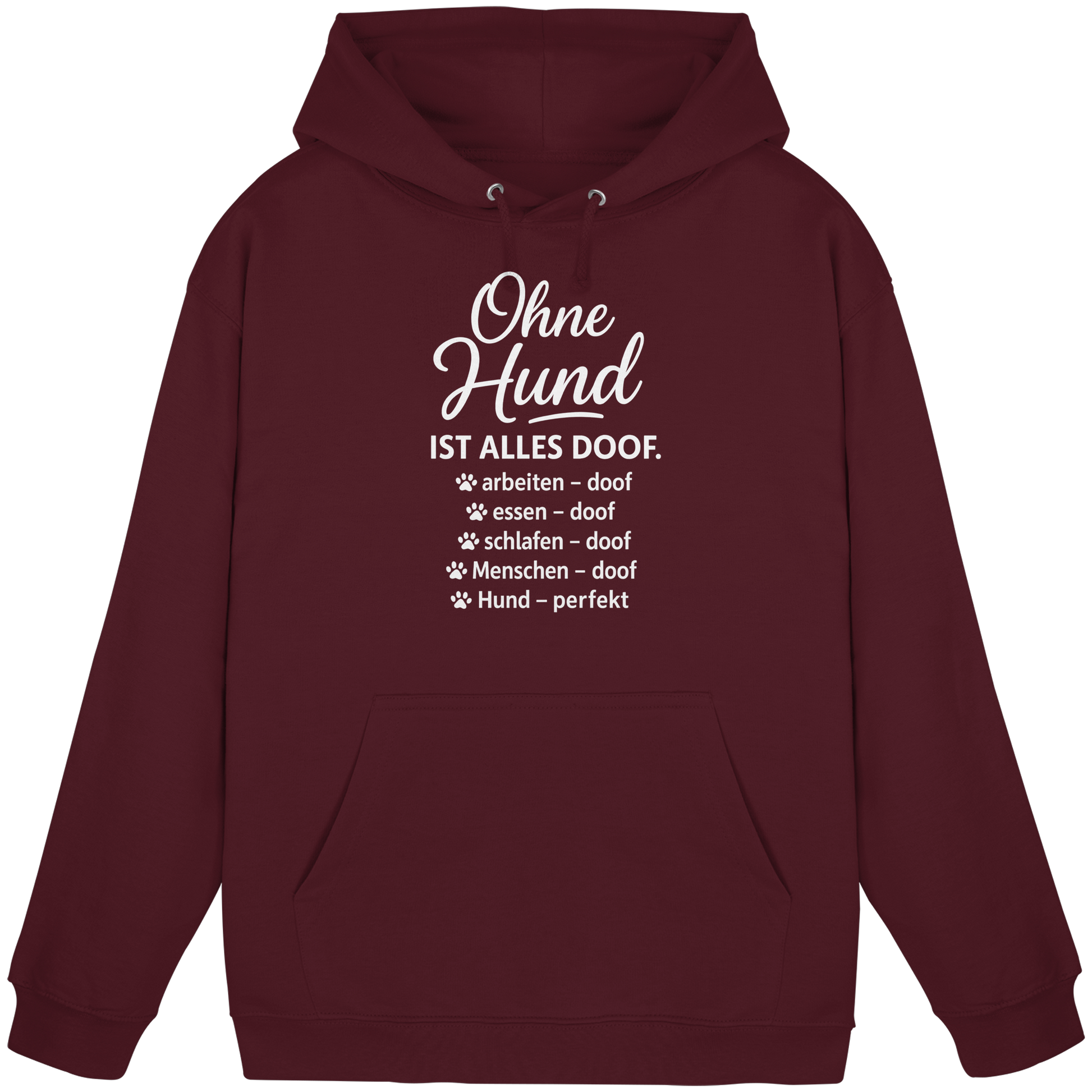 Ohne Hund ist alles doof und mit unserem Pfotenpoesie Hoodie wird’s endlich perfekt! Dieser liebevoll-freche Spruch bringt die Wahrheit auf den Punkt: Arbeiten, essen, schlafen alles doof… Hund? Perfekt.