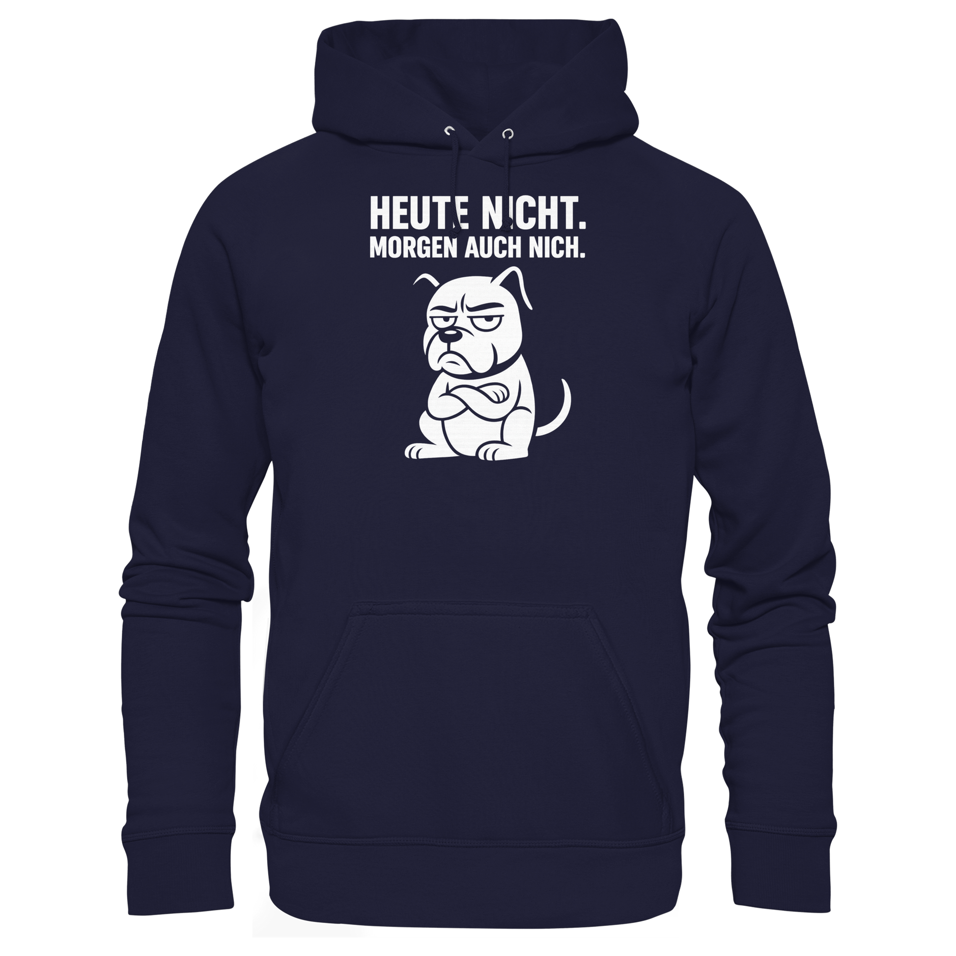 Unser Hoodie Heute nicht. Morgen auch nich bringt es mit einem Blick auf den Punkt – humorvoll, ehrlich und absolut hundetypisch.