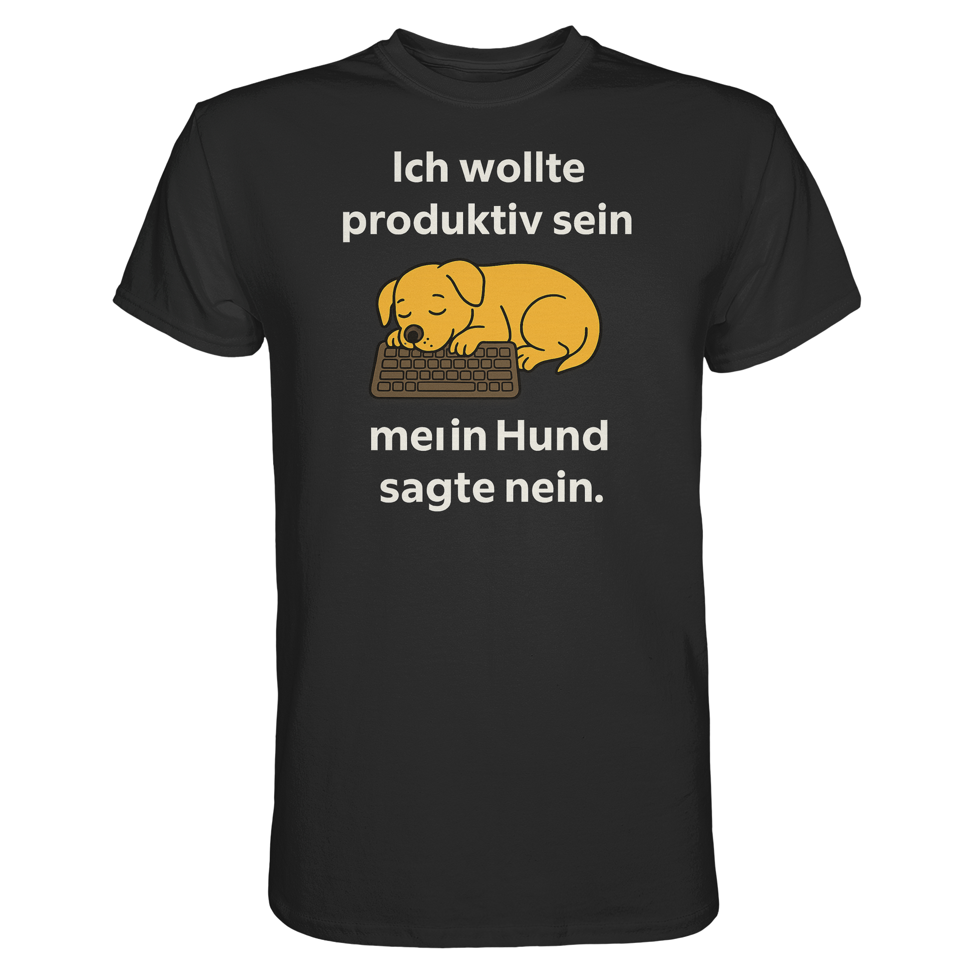 Das süße Motiv mit dem schlafenden Hund auf der Tastatur und dem Spruch Ich wollte produktiv sein mein Hund sagte nein.