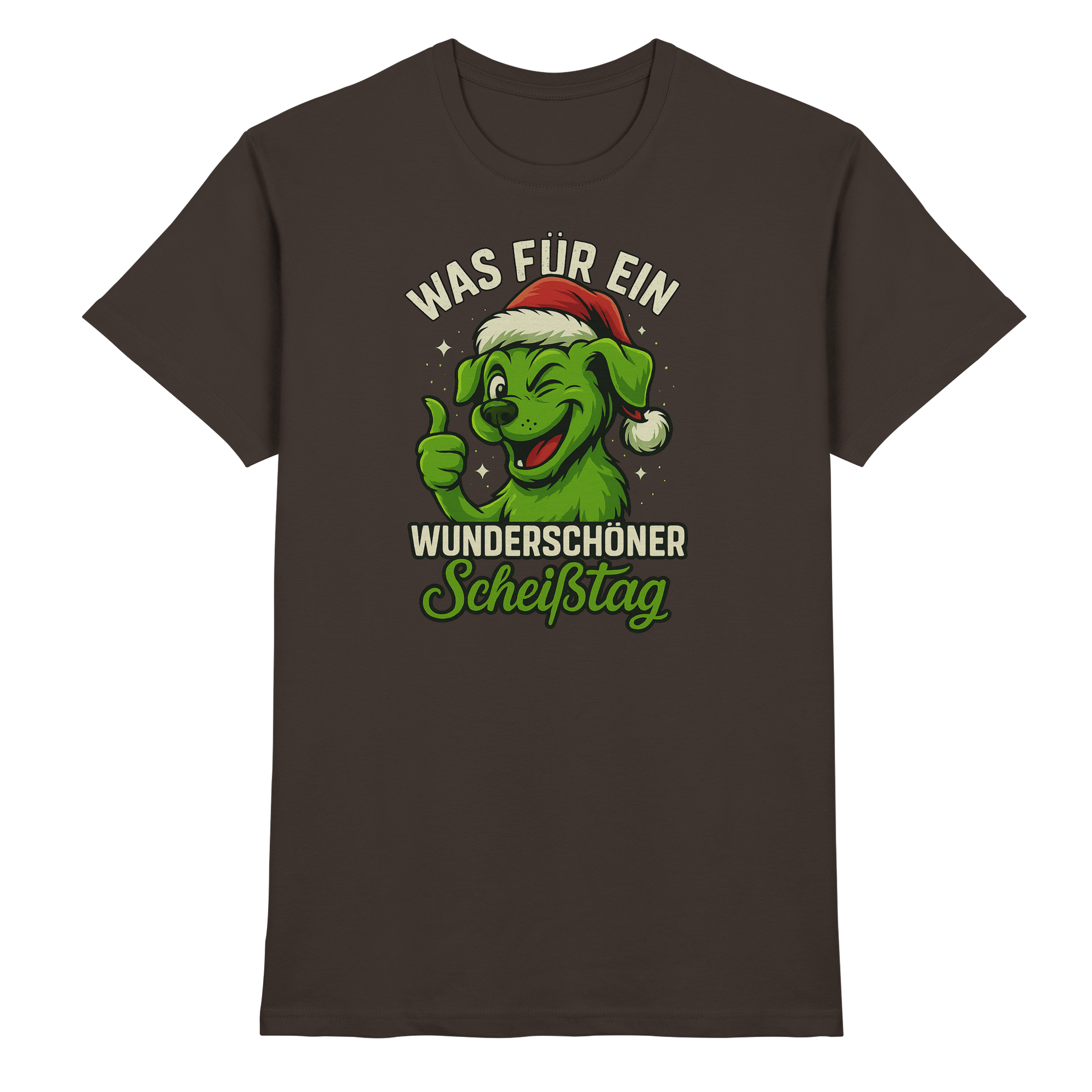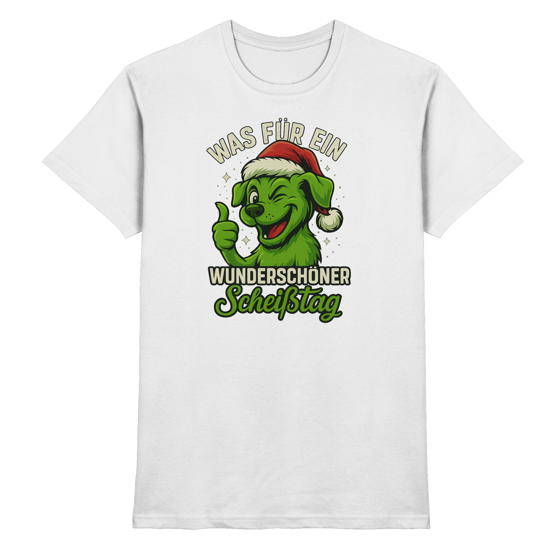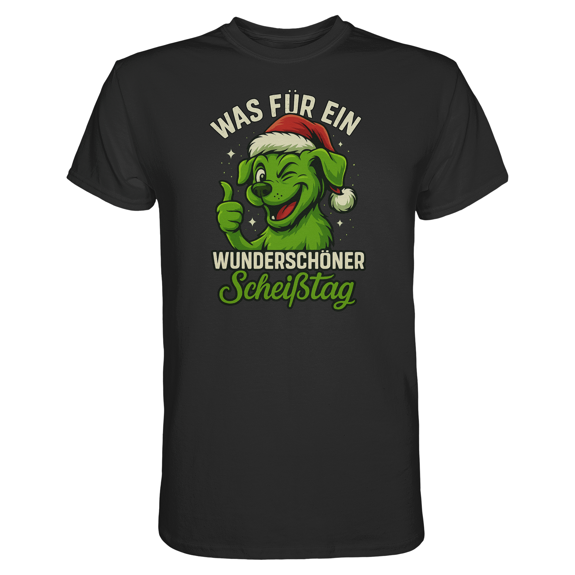 Der freche, grinsende Hund mit Weihnachtsmütze und dem Spruch Was für ein wunderschöner Scheißtag bringt schwarzen Humor, Lebenslust und Hundeliebe perfekt zusammen.