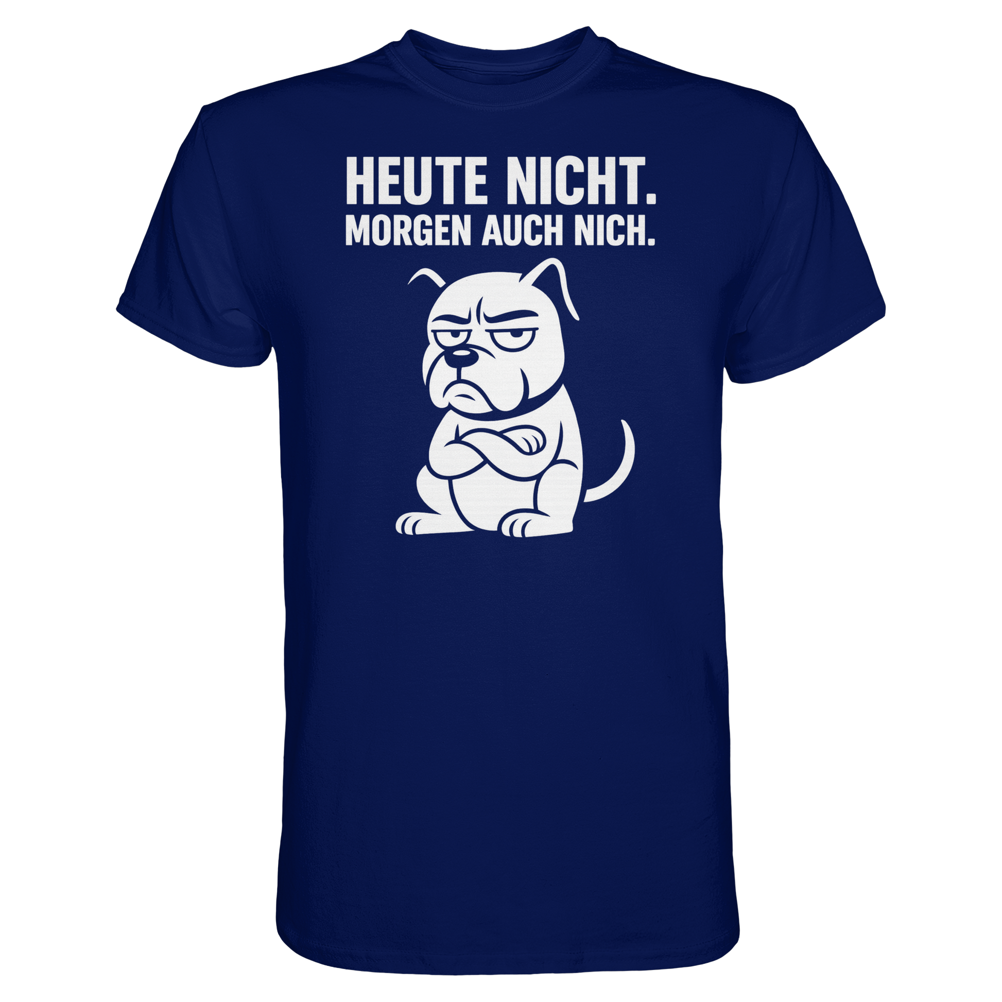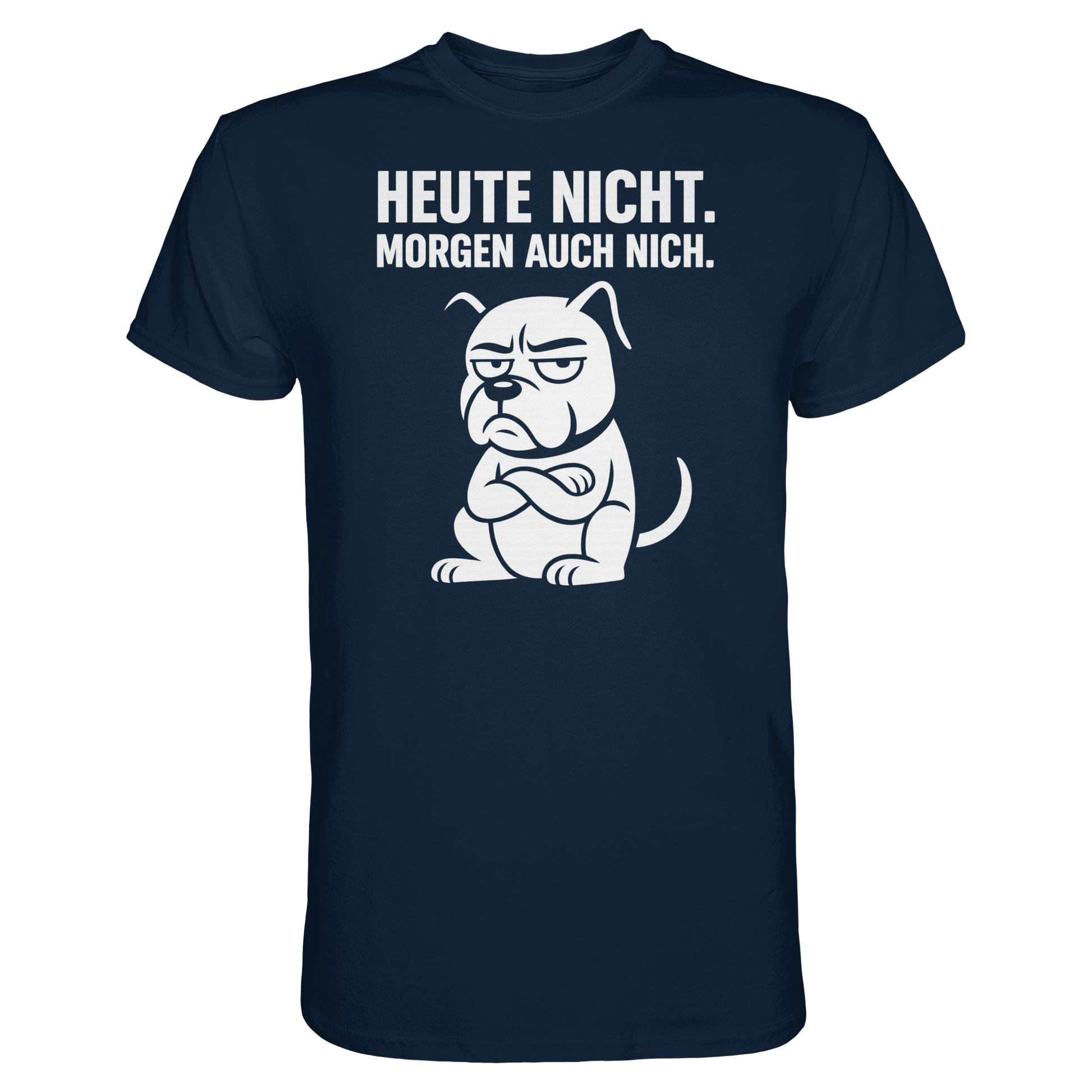 Unser Shirt Heute nicht. Morgen auch nich kombiniert trockenen Humor mit einem ausdrucksstarken Hunde-Motiv perfekt für alle, die ihren Alltag mit einem Augenzwinkern nehmen.