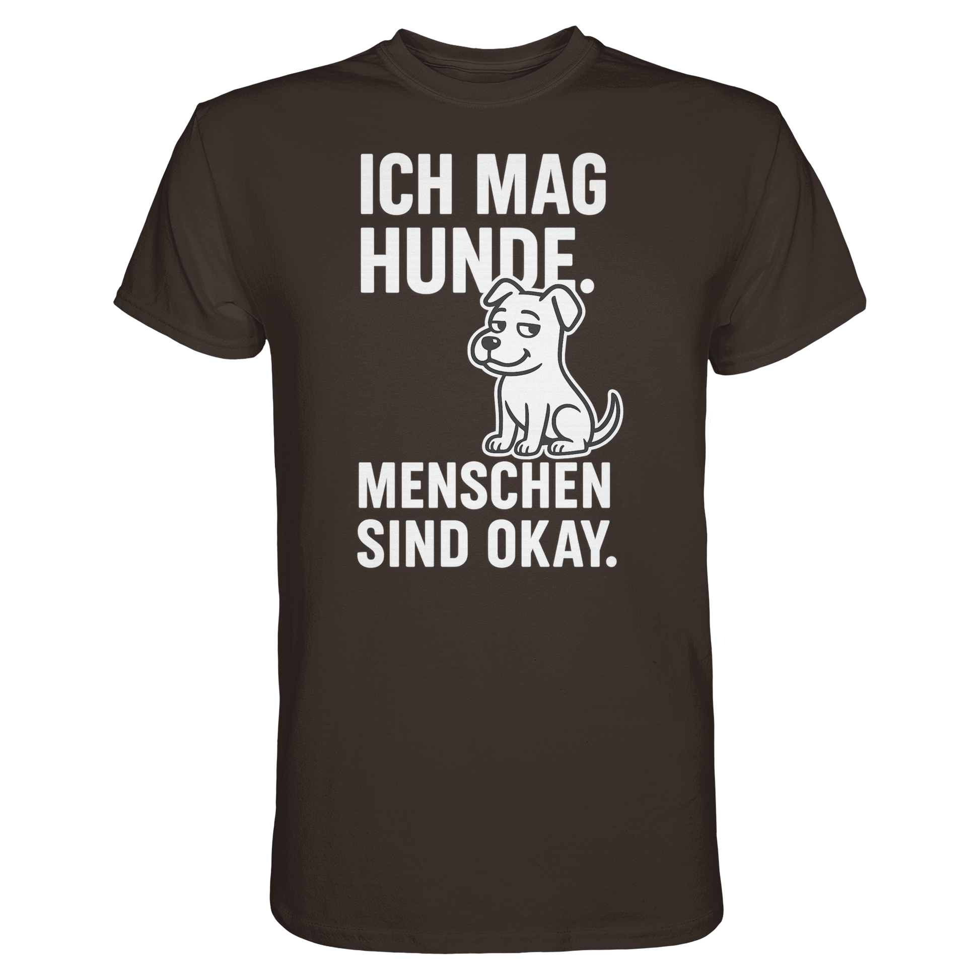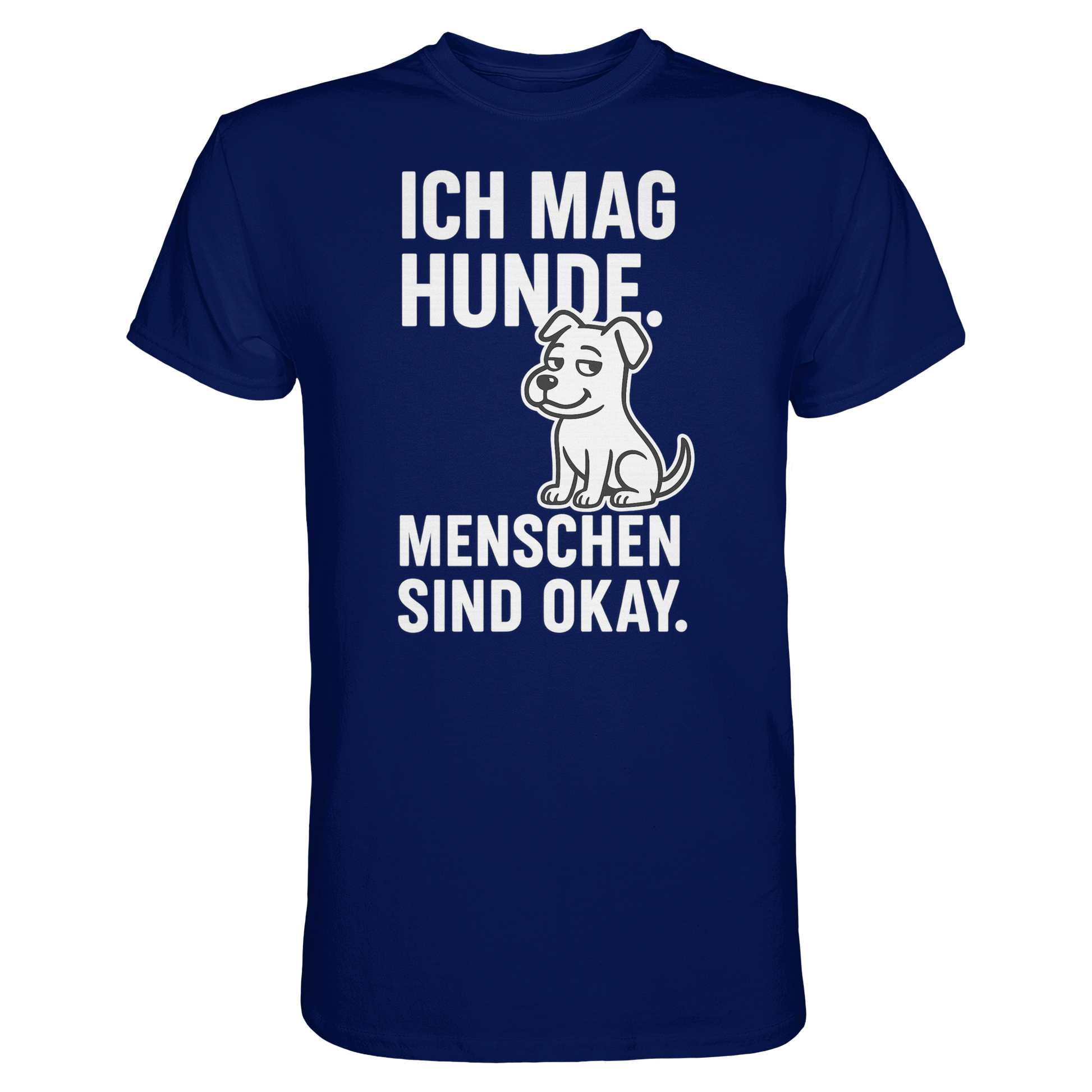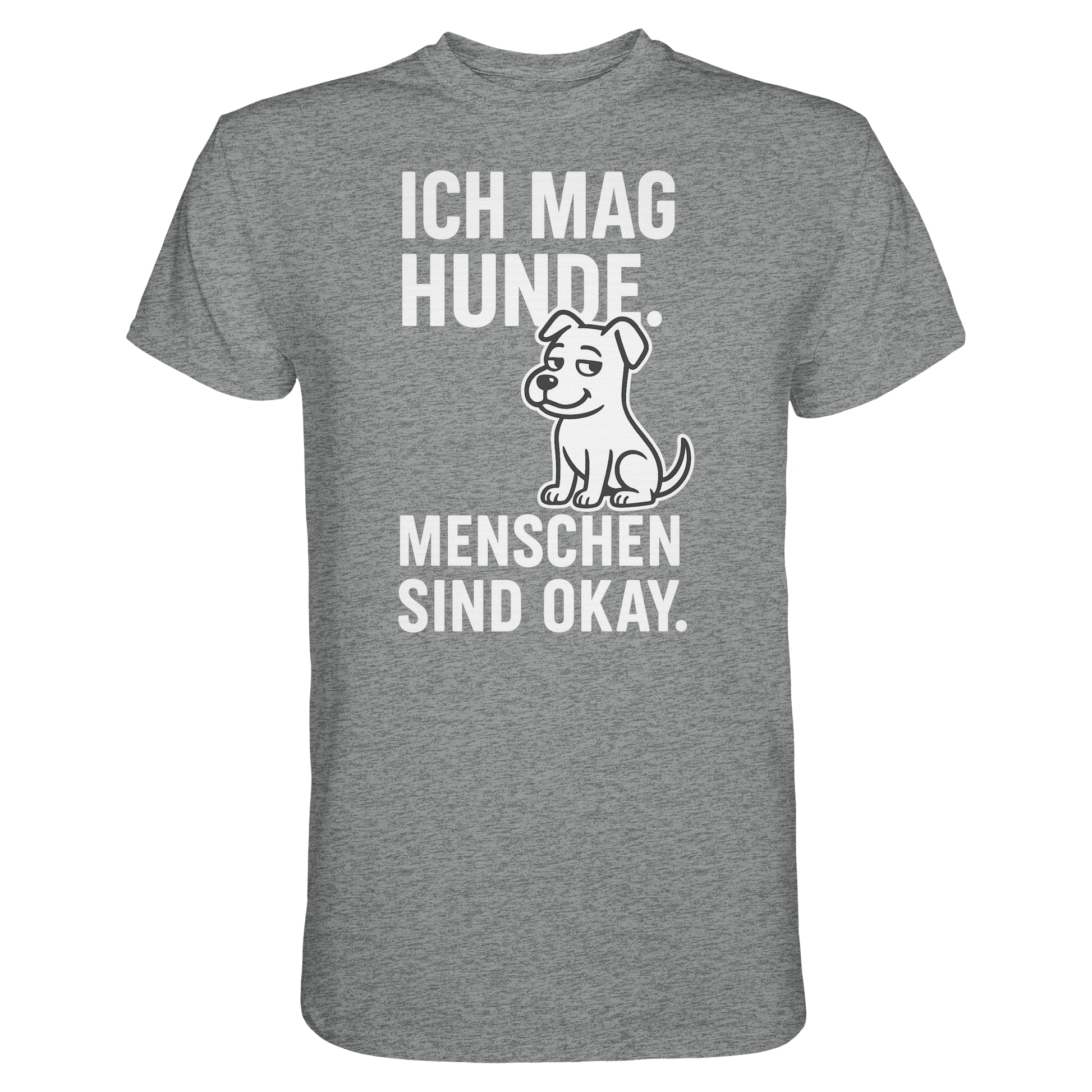 Unser Shirt Ich mag Hunde. Menschen sind okay. verbindet minimalistisches Design mit ehrlichem Humor und einem süßen Hunde-Motiv. Ein Statement-Shirt für echte Hundemenschen, die ihre Meinung mit einem Lächeln zeigen wollen.