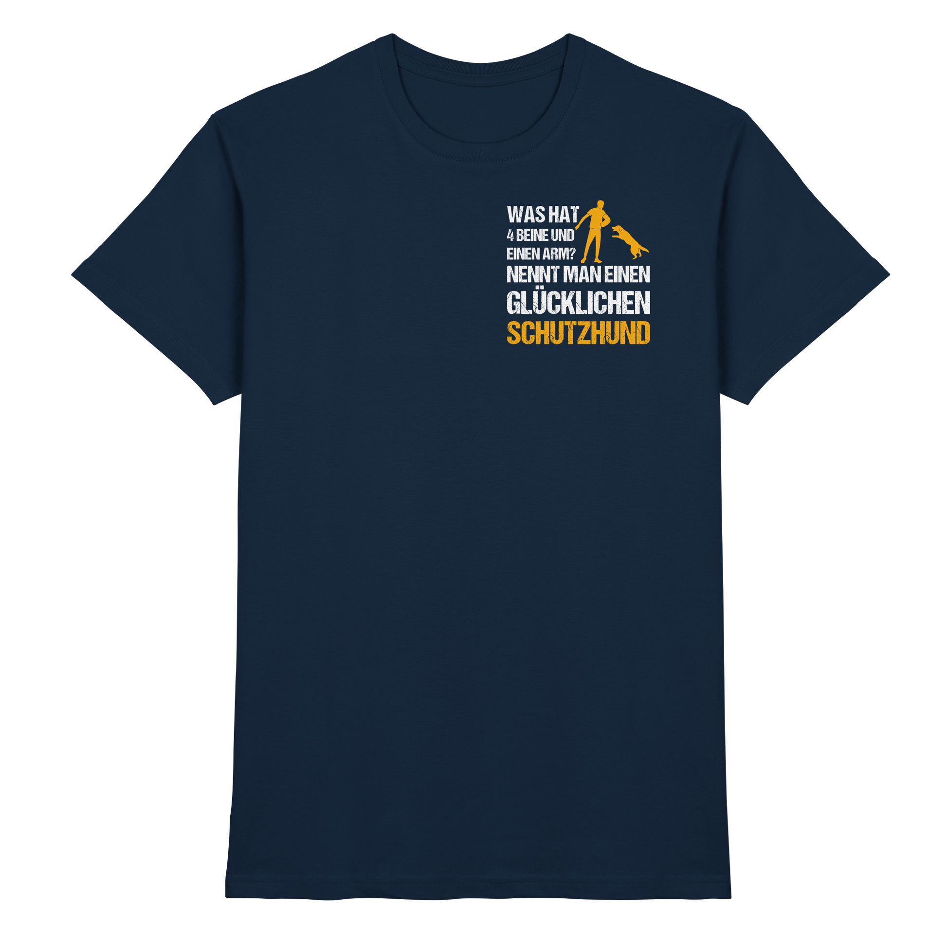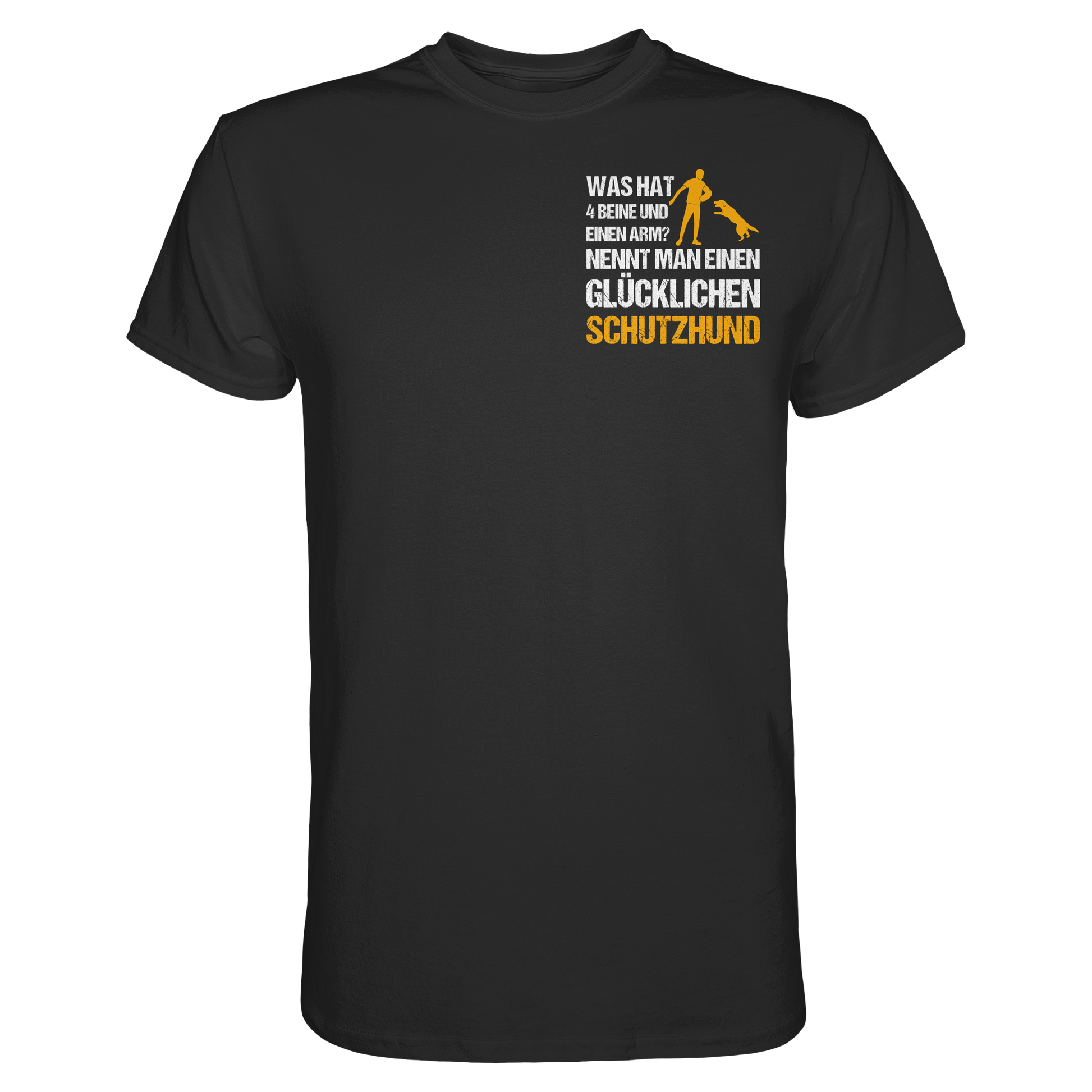 Mit Unserem Shirt  „Was hat 4 Beine und einen Arm? Nennt man glücklicher Schutzhund“ bringst du die besondere Stärke und Loyalität eines Hundes mit einem Augenzwinkern zum Ausdruck. Ein Statement für alle, die die Power und den Charakter ihrer Fellfreunde lieben.                                                                                                                                        Eignet sich Perfekt als Geschenk  für alle Hundemenschen.